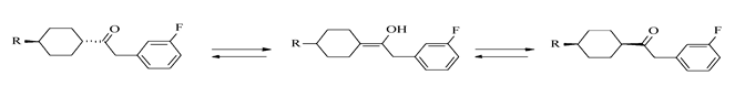 文献[1]中采用的方法,即使采用100%纯反式的4-烷基环己烷甲酸为原料,经过多步反应后也会产生大量不需要的顺式异构体,这可能来源于羰基与其烯醇式之间的互变异构(Scheme 3)。