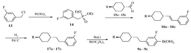 针对以上存在的问题,我们对关键中间体9a~9c的合成方法进行了改进,提出了一条新的合成方法,避免了环己烷的顺反异构化且无脱氟副产物的产生。 并对Suzuki偶联等步骤进行了工艺优化,最终产物总收率大幅提高,达到30%左右;产物的色谱纯度也提高到99.8%~99.9%,具备实际应用价值。 中间体9a~9c反应合成路线如Scheme 2所示。