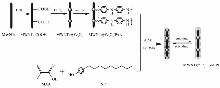 MWNTs@Fe3O4-MIPs的制备过程如图2所示。 首先对多壁碳纳米管羧酸化得MWNTs-COOH。 然后采用水热还原法在MWNTs-COOH表面接枝Fe3O4纳米颗粒,使MWNTs具有磁吸附性能。再与苯胺作用,合成MWNTs@Fe3O4/PANI。 然后以MAA和EGDMA分别为功能单体和交联剂,NP为模板分子,在AIBN引发下,在MWNTs@Fe3O4/PANI表面制备出MWNTs@Fe3O4-MIPs。 最后采用甲醇/乙酸(体积比9∶1)混合溶液将NP从印迹聚合物中洗脱下来。 这样印迹聚合物中就形成对NP具有特异性识别的印迹位点,成功制备出对NP具有高选择性和高吸附容量的磁性印迹复合材料。