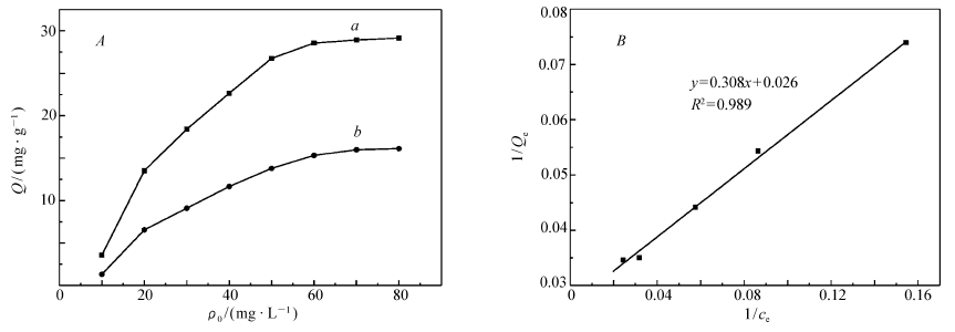 式中, Qe 为NP的静态吸附量(mg/g), Qmax 为等温吸附方程的饱和吸附量(mg/g), ρe是吸附平衡时NP质量浓度(mg/L), K为吸附平衡常数(L/mg)。 以1/ Qe为 Y轴,1/ ρe为 X轴作图,拟合曲线图8 B,可以计算出 K=0.08 L/mg, Qmax=38.46 mg/g。