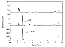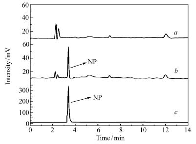 图8中曲线 a、 b和 c分别为实际样品、加标样品以及M-SPE处理后洗脱液色谱图。 如图8谱线 a所示,实际水样品中没有发现NP的色谱峰。加标后的水样中能清楚的看到NP的色谱峰,磁固相萃取后,洗脱液中NP的色谱峰明显高于加标溶液色谱峰,比较谱线 b和 c中NP的色谱峰面积,可计算出印迹固相萃取后,NP的富集倍数为6.0。 这表明采用该MWNTs@Fe3O4-MIPs能够对湖水中的NP实现简单快速的分离、富集检测。