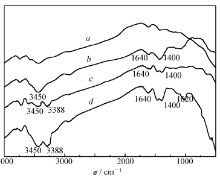 2.1.2 红外光谱分析图4为MWNTs(谱线 a)、MWNTs@Fe3O4(谱线 b)、MWNTs@Fe3O4/PANI(谱线 c)以及MWNTs@Fe3O4-MIPs(谱线 d)的红外光谱图。图4谱线 b、 c、 d中591 cm-1处为Fe—O的收缩振动峰,这表明Fe3O4纳米粒子成功接枝在多壁碳纳米管表面。 1640和1400 cm-1则是碳纳米管中的C=C的特征吸收峰;3450 cm-1处则是—OH的特征吸收峰;在图4谱线 c和 d图中3388 cm-1处则是PANI中的N—H伸缩振动峰;这表明PANI印迹壳层成功修饰到MWNTs/Fe3O4表面。 在图4谱线 d中1020 cm-1处C—O—C伸缩峰强度增加表明乙二醇二甲基丙烯酸酯(EGDMA)的存在,该结果表明印迹聚合物已成功接枝在碳纳米管表面。