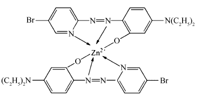 本文采用2-(5-溴-2吡啶偶氮)-5-二乙氨基酚(简称“5-Br-PADAP”,如图1所示)作为镀锌工具遗留印迹的显色剂。 它是一种优良的分析试剂,已广泛用于光度分析、色谱分析以及电化学分析[7]。 在水溶液中,Zn2+与5-Br-PADAP会发生配合反应,生成配合比为1:2的品红色配合物,如图2所示。 在5-Br-PADAP中,N=N是生色团,强吸电子基-Br与强斥电子基—N(C2H5)2为2个助色团,助色团上的孤对电子也参与了整个分子的配合,使外层电子的流动性增大,从而使反应的灵敏度增加。 其中,—N(C2H5)2对配合物的配合以及稳定性起到了非常重要的作用[8]。 本文通过考察接触时间、时间间隔、试剂浓度、是否洗手等影响因素,初步建立5-Br-PADAP溶液显现镀锌工具遗留印迹的方法。 此外,通过考察显出率对其可靠性进行了统计学验证。