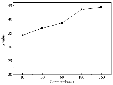 本实验设置了10~300 s的系列接触时间。 由图3可知,当接触时间仅为10 s时,就可以清晰地显出镀锌工具的遗留印迹。图4为显现强度随接触时间增加的变化情况,在10 s到60 s之间, a值不断增大,即印迹的强度增强,但增强的速度较为平缓。 在60~180 s之间,印迹强度急剧增加。 但是在180~300 s之间,增长的幅度变缓,印迹强度差别减小,即将达到饱和的状态。镀锌工具遗留印迹系列接触时间变化规律与铁质客体遗留印迹相同。