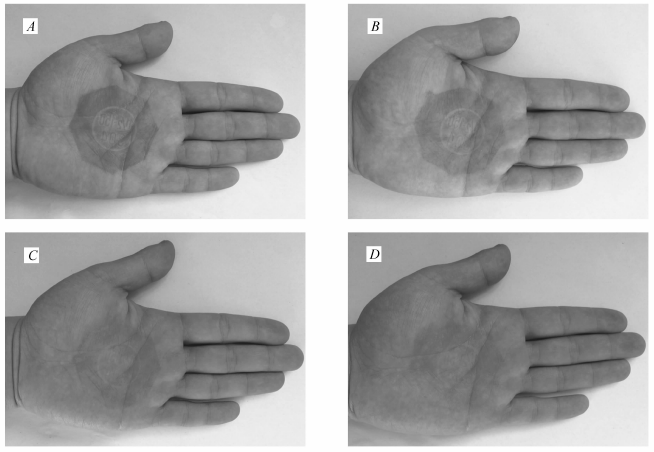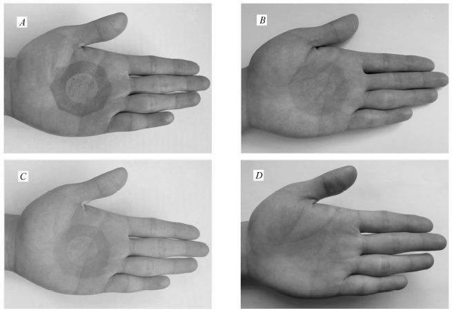 | 图7 各个间隔时间洗手前后效果对比图Fig.7 Imprints with different intervals after washing A.0 h interval without washing; B.0 h interval with washing; C.1 h interval with washing; D.4 h interval with washing |