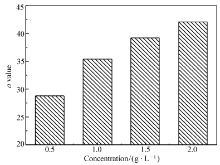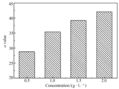 从图6可以看出,接触时间1 min,浓度为0.5 g/L就可以显现出清晰的印迹。 随着5-Br-PADAP浓度的增大, a值不断上升,即5-Br-PADAP溶液显现印迹的强度不断增强,但在1.5 g/L后, a值的增加幅度变缓,印迹的强度相差不大。 因此,本着节省试剂的原则,1 g/L的5-Br-PADAP溶液用于喷洒显现即可。