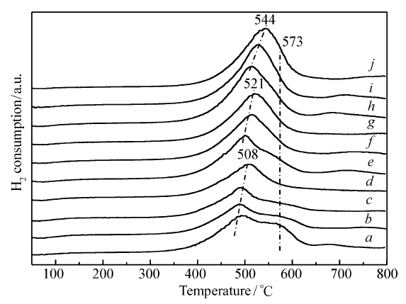 | 图3 不同Ce掺杂量TiO2负载V2O5后 yV/ xCe-TiO2催化剂的H2-TPR表征曲线Fig.3 H2-TPR profiles of the TiO2/ xCe- yV2O5 catalyst samples with different Ce and V2O5 contents a.5V/ TiO2; b.5V/1Ce-TiO2; c.5V/3Ce-TiO2; d.5V/5Ce-TiO2; e.10V/1Ce-TiO2; f.10V/3Ce-TiO2; g.10V/5Ce-TiO2; h.15V/1Ce-TiO2; i.15V/3Ce-TiO2; j.15V/5Ce-TiO2 x, y:seeFig.1 |