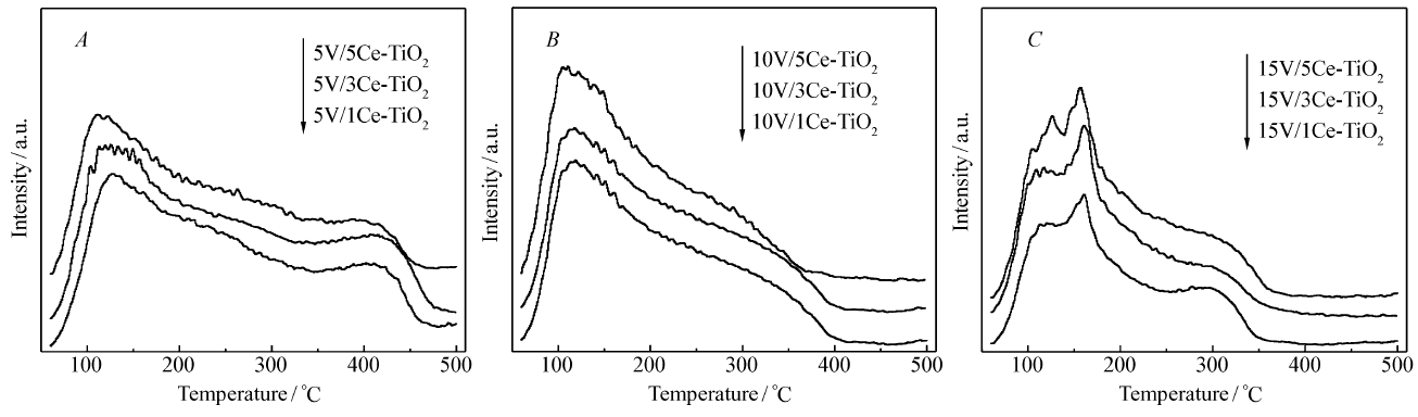 | 图5 不同Ce掺杂量TiO2负载V2O5后 yV/ xCe-TiO2催化剂的NH3-TPD表征曲线Fig.5 NH3-TPD profiles of the yV/ xCe-TiO2 catalyst samples with different Ce and V2O5 contents x, y:seeFig.1 |
