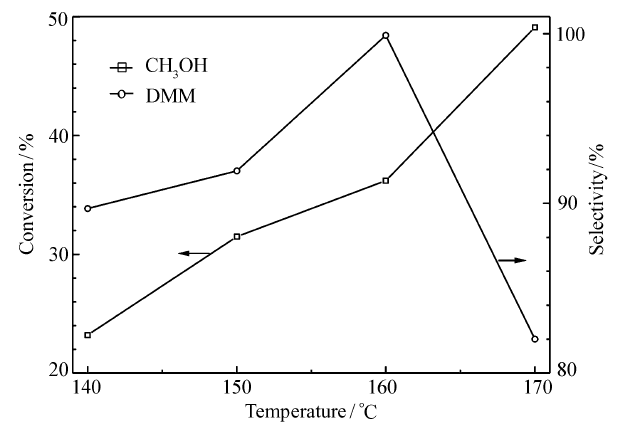图6为催化剂10V/3Ce-TiO2上,反应温度对甲醇转化率和DMM选择性的影响。 从图6可见,在反应温度140 ℃时,甲醇的转化率为23.2%,DMM的选择性为89.7%,随着反应温度的升高,甲醇的转化率随逐渐增大,在160 ℃时甲醇的转化率升高至36.2%,DMM的选择性高达99.8%。 但是反应温度升高至170 ℃,虽然甲醇的转化率达到了49.1%,但DMM的选择性则迅速下降至82.0%。