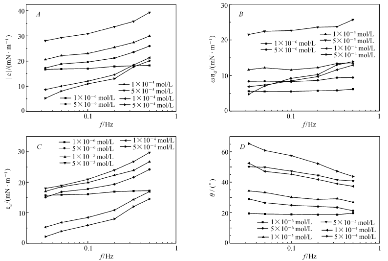 界面扩张粘弹性参数随扩张频率的变化能反映界面吸附膜性质。图1给出了25.0 ℃时不同浓度表面活性剂C12imSP/0.1 mol/L NaCl溶液表面的扩张模量、弹性模量、粘性模量和相角随频率的变化曲线。 由图1 A可知,表面活性剂浓度不同,体系的扩张模量对频率的依赖关系有着明显的差异。 当体系中表面活性剂C12imSP浓度较低时(1×10-6 mol/L),扩张模量几乎不随扩张频率的变化而改变,这意味着界面面积变化的快慢对界面张力改变影响不大,说明此时在界面上起主导作用的弛豫过程较慢,其特征时间远远慢于实验周期,界面吸附膜的弹性较强。 随着表面活性剂浓度的提高,扩张频率对扩张模量的影响逐渐增强,扩张频率越大,体系的扩张模量越大,而相角越小(图1 D)。 显然,扩张频率越大,给予被扰动的界面吸附膜通过扩散交换等弛豫过程重新恢复平衡的时间就越短,扩张模量增大;同时,由于弛豫过程作用时间较短,贡献较小,粘性部分所占比例降低,相角逐渐减小。