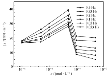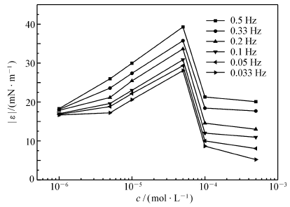 图2给出了不同频率下表面活性剂C12imSP/0.1 mol/L NaCl溶液表面的扩张模量随体相表面活性剂浓度的变化曲线。 由图2可知,不同频率下溶液界面扩张模量随体相浓度变化趋势一致。