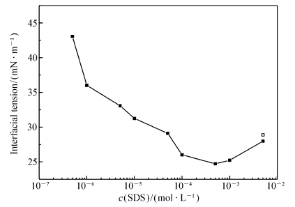 我们对SDS(5×10-3 mol/L)/NaCl(0.1 mol/L)体系的平衡表面张力进行了测量,发现该体系的平衡表面张力和SDS(5×10-3 mol/L)/C12imSP(1×10-4 mol/L)/NaCl(0.1 mol/L)混合体系的平衡表面张力几乎一致,这在一定程度上暗示了混合体系中SDS浓度较高时,表面吸附膜中以SDS分子为主。