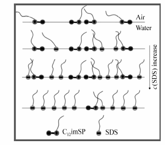 综合上述对实验结果的分析,可以初步推断出SDS的加入对C12imSP/NaCl(0.1 mol/L)体系表面聚集行为的影响。 当体系中仅含1×10-4 mol/L C12imSP时,C12imSP分子在表面松散排列。 少量传统表面活性剂SDS的加入可以有效填补表面上的空位,表面上形成两种表面活性剂的混合吸附膜。 随着SDS的不断引入,嵌入表面的SDS分子逐渐增多,直到表面吸附达到饱和,体相中混合胶束形成。 SDS浓度的进一步提高使得其在体相和表面分子扩散交换作用增强,一旦C12imSP分子脱离表面,体相胶束中富集的SDS分子对C12imSP分子的“收纳”作用及进一步的“挽留”作用,加之C12imSP分子本身相对较大的空间位阻效应导致其很难再回复到界面。 因此,界面逐渐被SDS分子所占据。图5给出了SDS的加入对C12imSP/NaCl(0.1 mol/L)体系表面上分子聚集行为影响示意图。