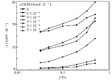 发现两溶液的表面扩张模量随频率的变化曲线相差不大,特别是低频范围两曲线几乎重合。 这进一步佐证了当体系中SDS浓度较高时(达到5×10-3 mol/L),界面几乎完全被SDS分子占据。