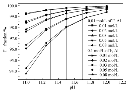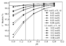 虽然不同F/Al比体系,添加NaOH逐步掩蔽铝的机理是不同的,但是在pH值11~12,铝以四羟基铝的形式被掩蔽,氟几乎完全游离出来,F-分布分数在pH=11.5达到99.5%。