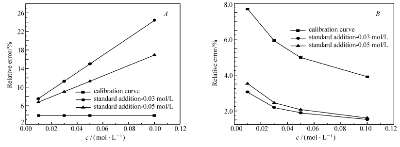 | 图5 电势误差( A)和电极斜率误差( B)误差为1 mV时,标准曲线法和标准加入法测定结果的相对误差Fig.5 Relative error of calibration method and standard addition method at 1 mV of potential error( A) or slope error( B) |