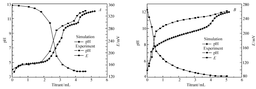 由图1可知,电势随着滴定体积增加逐渐降低,最后稳定。 A、B体系pH值为11.5左右的电势分别为139.3 mV和83.1,由此计算得到电极斜率为56.2 mV,结果合理。