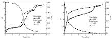 可以看出,pH值为7以下,两个体系主要物质是AlF x,这和文献[14]报道的氟铝配合物是F--Al3+体系酸性条件下的主要组分是一致的。 当NaOH开始滴加后,A体系Al3+优先和OH反应生成Al(OH)3沉淀,随着pH值增加,OH主要加成到AlF x中,并逐步取代F释放F-;由于Al(OH)3沉淀和F-反应的平衡时间长达2 h[15],此反应可忽略,所以A体系Al(OH)3沉淀存在于很宽的pH值范围且沉淀量几乎不变。B体系由于总氟浓度高,一开始体系无自由Al3+,NaOH连续滴加时,OH逐渐取代AlF x中F,直至生成Al(OH
