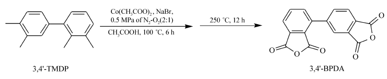 联苯型聚酰亚胺作为一种高性能聚合物,具有耐热、耐溶剂、耐辐射以及良好的力学性能和介电性能,在机械电子、航空航天、大型电机、水轮机轴承、耐热滤材等领域具有广泛的应用前景[1,2,3,4]。 与对称结构的3,3',4,4'-联苯四甲酸二酐(4,4'-BPDA)为单体的聚酰亚胺相比,非对称结构异构体—2,3,3',4'-联苯四甲酸二酐(3,4'-BPDA)为单体的聚酰亚胺具有更高的 Tg和较低的熔体粘度,显著提高了材料制备过程中的可加工性[1]250-282[5,6]。 因此,采用3,4'-BPDA代替4,4'-BPDA基体树脂的工作受到越来越多的关注[7,8,9,10,11,12]。 目前,广泛使用的3,4'-BPDA合成方法是以邻苯二甲酸二甲酯或混合氯代邻苯二甲酸二甲酯为原料,经偶联、水解等过程制得[13,14,15]。 但在这类方法中,偶联反应产物为3种异构体(3,3'-、3,4'-和4,4'-联苯四甲酸四甲酯)的混合物,导致分离成本较高且分离产率较低;酯水解过程中涉及浓酸或浓碱,极大增加了环境成本。 因此,通过分子设计,高效、简便地合成非对称结构3,4'-联苯四甲酸二酐(3,4'-BPDA)具有较高的理论意义和实际应用价值。