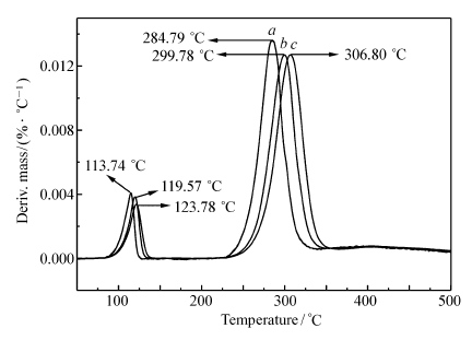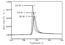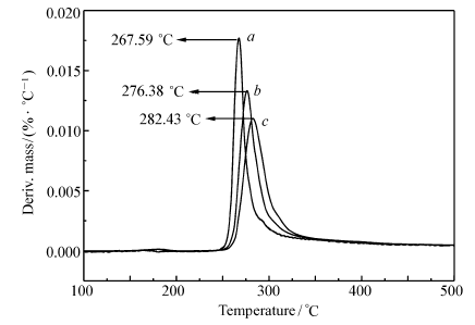 图8和9分别为化合物Ⅰ和Ⅱ在3个不同升温速率 β的DTG曲线,利用式(2)和(3),即可求得化合物Ⅰ和Ⅱ的指前因子(lg A)、线性相关系数( r)和表观活化能( Ea),计算结果见表4。 从表4可以看出,两种计算方法得到的结果基本相同。 化合物Ⅰ的分解温度高于267 ℃,表观活化能为176.6 kJ/mol。 化合物Ⅱ的分解温度高于284 ℃,表观活化能为122.9 kJ/mol,表明化合物Ⅰ和Ⅱ均具有较好的热稳定性。