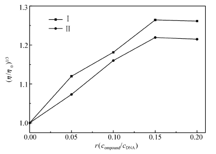 式中, t为化合物与CT-DNA溶液(含浓度不等的化合物)流经毛细管所需时间, t0为缓冲溶液流经毛细管所需时间。 以( η/η0)1/3对结合比率 r=ccompound/ cDNA作图, η0为未加化合物时CT-DNA溶液的相对粘度, η为加入化合物时CT-DNA溶液的相对粘度。