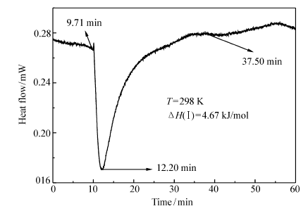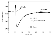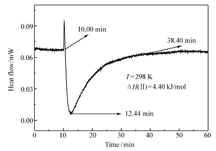 图11、12分别为化合物Ⅰ和Ⅱ与CT-DNA相互作用的热谱曲线,可以看出两个反应均为吸热过程。 化合物Ⅰ从 9.71 min开始到37.50 min平衡,反应时长为27.79 min,反应热流值在12.20 min时达到最大;化合物Ⅱ与CT-DNA 的相互作用趋势和化合物Ⅰ相似,它的反应时长为28.40 min,表明化合物Ⅰ和Ⅱ与CT-DNA的相互作用十分迅速。 化合物Ⅰ和Ⅱ的焓变值分别为Δ H(Ⅰ)=4.67 kJ/mol和Δ H(Ⅱ)=4.40 kJ/mol,表明化合物Ⅰ和Ⅱ与CT-DNA的作用主要以插入模式为主[19],与粘度实验的结果相一致。