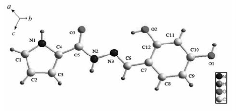 1.2.2 化合物Ⅰ的合成 称取2-吡咯甲酰肼0.0125 g(0.1 mmol),将其溶于无水乙醇中,加热搅拌溶解后溶液呈无色透明,再将2,4-二羟基苯甲醛0.0138 g(0.1 mmol)溶于乙醇中并缓慢加入2-吡咯甲酰肼溶液中,溶液为淡黄色、透明,在80 ℃水浴加热搅拌下回流2.5 h,使其完全反应,静置3 d后出现淡黄色片状晶体。 产率90.9%,熔点269~271 ℃。 元素分析测试值/%:C 58.67,N 19.25,H 4.35;计算值/%:C 58.72,N 17.13,H 4.49。 IR(ATR), σ/cm-1:3418,3320,3219,3143,1626,1549,1510,1407,1315,1097,853,736,675;1H NMR(DMSO-d6,400 MHZ), δ:11.72~11.49(q,3H,OH),9.90(s,1H,NH),8.41(s,1H,N=CH),7.30~6.94(m,3H,Ar—H),6.37~6.17(m,3H,Pyrrole-H)。