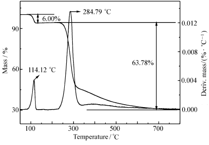 准确称取(10.0±0.05) mg的化合物放入氧化铝坩埚内,在Mettler Toledo TG-DSC1热重分析仪上测定化合物的热分解过程,实验条件为室温至800 ℃,N2气气氛,升温速率分别为5.00、10.00和15.00 ℃/min。