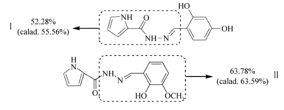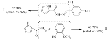 1.2.3 化合物Ⅱ的合成 化合物Ⅱ的合成方法与化合物Ⅰ相似,只需要将2,4-二羟基苯甲醛替换成2-羟基-3-甲氧基苯甲醛,得到淡黄色针状晶体。 产率85.9%,熔点237~239 ℃。 元素分析测试值/%:C 60.23,N 18.53,H 5.01;计算值/%:C 60.17,N 16.20,H 5.79。 IR(ATR), σ/cm-1:3540,3361,3255,1555,1464,1407,1311,1250,1184,1133,838,726,600;1H NMR(DMSO-d6,400 MHZ), δ:11.78~11.71(t,2H,OH),11.40(s,1H,NH),8.55(s,1H, N=CH),7.14~7.03(m,3H,Ar—H),7.01~6.84(m,3H,Pyrrole-H),3.84~3.82(t,3H,OCH3)。