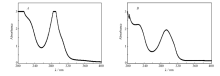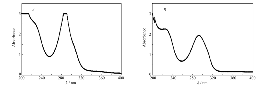| 图1 5,6-二甲基-2,3-吡嗪二甲酰胺( A)及其铜配合物( B)的紫外光谱Fig.1 UV spectra of 5,6-dimethyl-2,3- pyrazinedimethylformamide( A) and its copper cmoplex( B) |