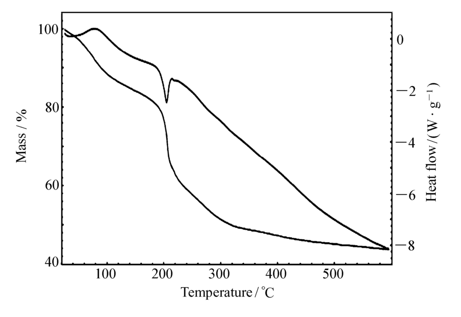 | 图3 5,6-二甲基-2,3-吡嗪二甲酰胺-铜配合物的差热热重分析图Fig 3 DSC-TGA curves of 5,6-dimethyl-2,3-pyrazinedimethylformamide-Cu |