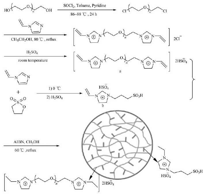 由此可见,温控体系虽具有较强的催化活性和较好的温控自分离特点,但体系中的离子液体仍存在流失大、易失活的缺陷。 本文结合温控两相离子液体的自分离特性[16,17]及聚合物大分子[18]在反应体系中不易流失的优点,以聚乙二醇为主链,双键取代咪唑型离子液体为交联剂,采用自由基聚合方法,设计合成出一种具有温控两相功能、催化活性高、流失量小的酸性聚合型离子液体(PIL),并验证了其在胺醛缩合反应中的催化效果。
