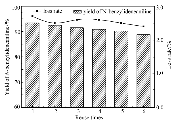 由图3可知,PIL重复使用6次,PIL的催化活性基本保持不变,产物 N-亚苄基苯胺的收率稳定在89%~93%;PIL流失率较低,约为2.5%。