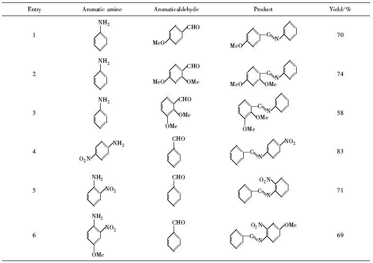 由表5可知,在PIL/甲苯温控体系中,含不同取代基的芳胺与芳醛的缩合反应均能顺利进行且可达到较高收率,说明该体系对芳胺与芳醛缩合反应具有广泛的适用性。