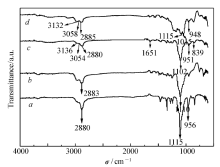 | 图2 PEG-1000( a)、PEG-1000Cl2( b)、PEG-1000VIL( c)和PIL( d)的FT-IR谱图Fig.2 FT-IR spectra of PEG-1000( a), PEG-1000Cl2( b), PEG-1000VIL( c) and PIL( d) |