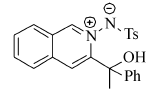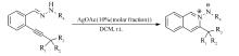 将含有不同取代基团的邻炔基苯甲醛腙化合物在乙酸银催化下,以二氯甲烷作溶剂,室温下自身发生环化反应合成 N, N-异喹啉偶极子化合物。 通过质谱(MS)、核磁共振波谱仪(NMR)等技术手段表征化合物的结构。 考察了不同催化剂及其用量、原料配比、溶剂、温度对反应的影响。 在最优条件下,反应收率为60%,在底物适应性上最高可达到85%。 该方法具有操作简单,反应条件简单温和,产物收率高以及底物适用性好等优点。 本文通过对实验条件、底物适用性等方面的探索,解决了以往合成异喹啉偶极子方法学中存在的多步进行、反应温度过高、底物适应性较低等不足与缺点,为制备含此类骨架的化合物提供了新的实验方法。
