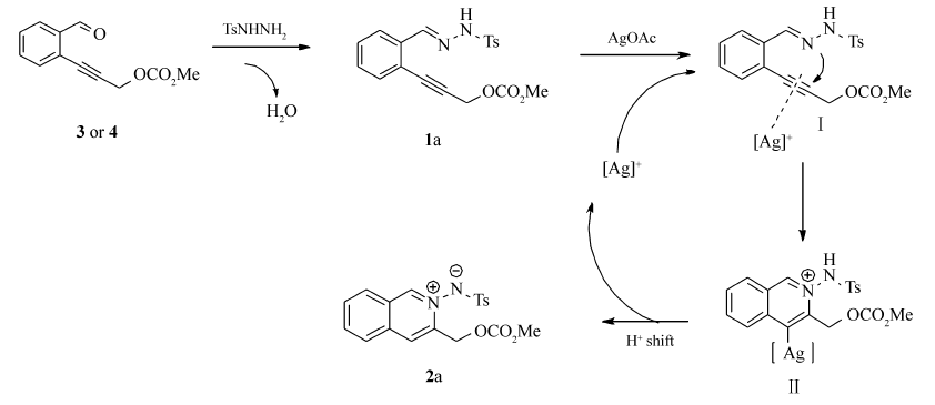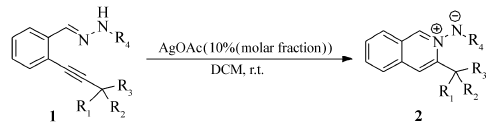 异喹啉类骨架是一种很重要的含氮杂环结构,广泛存在于许多生物活性天然产物[1]和药物的结构中[2,3]。 其中,异喹啉氮杂环偶极化合物作为异喹啉类骨架的一种极重要的延伸,更是受到众多科研工作者的青睐,由它进一步构建的多取代 H-吡唑并[5,1-a]异喹啉衍生物在医学上更是表现出显著的生物活性,对细胞分裂周期蛋白25B(CDC25B),T细胞蛋白酪氨酸磷酸酶(TC-PTP)及蛋白酪氨酸磷酸酶1B(PTP1B)表现出良好的抑制能力[4]。 自2009年起,多种构建多取代异喹啉氮杂环偶极化合物的方法被报道[5,6],通过过渡金属催化环化和交叉偶联的方法来构建官能团化的异喹啉氮杂环偶极衍生物也陆续被报道[7,8]。 我们小组一直研究氮源进攻金属催化剂活化的炔键成环的工作,并取得了一定的成果。 受大量有关偶极化合物和金属催化在有机化学中应用的启发[9,10], 我们提出了以邻炔基苯甲醛为初始原料,通过邻炔基苯甲醛腙合成氮杂环偶极化合物的设想(Scheme 1)。