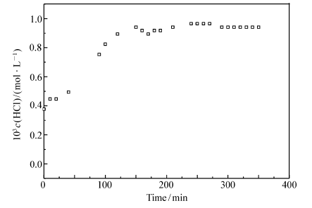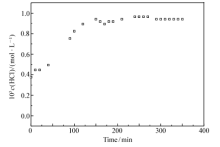 在中空纤维分散液膜稳定时间测定实验中,采用图1中空纤维分散液膜实验装置,充分搅拌反萃分散相,使有机相以微小液滴的形式均匀地分散在反萃剂中,共同进入膜接触器壳程,料液相进入中空纤维管内,两相以连续逆流方式接触。 料液初始浓度为0.025 mol/L,反萃相氢离子浓度4.00 mol/L。 用蠕动泵控制流速,保持两相流速不变。 为确定中空纤维分散液膜操作稳定性,在固定操作条件下进行长时间实验,考察料液相出口浓度随时间的变化趋势。 由图2可见,实验进行120 min后,料液出口的浓度已达到稳定,连续长时间测定,反萃分散液膜可以保持稳定的传质性能。