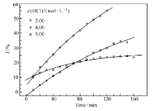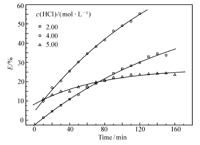 分散相与料液相中的H+浓度差是稀土离子Yb3+的传质动力,改变反萃剂的浓度也就是改变了Yb3+在液膜中的传质动力。 如图3所示,当HCl浓度分别为2.00、4.00和5.00 mol/L,120 min时Yb3+的萃取率( E)为29.83%、55.28%和23.55%。 分散相中盐酸浓度小于2.00 mol/L时,反萃不完全。 但当反萃剂的浓度增大到5.00 mol/L时,两相间传质推动力大,传质速率快。 由于分散相与料液相间的H+浓度差过大,反萃剂中H+向料液相渗透,增大了料液相的酸度,萃取率反而降低。 因此, 在后续实验中,反萃分散相反萃剂HCl浓度均为4.00 mol/L。