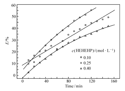 稀土元素的萃取过程伴随着金属离子从一相转到另一相,相内和相界面的物质传递过程极大地影响着萃取过程的进行。 因此,研究了萃取剂浓度对Yb3+在中空纤维分散液膜技术中的萃取行为的影响。 如图4所示,萃取剂浓度分别为0.10、0.25和0.40 mol/L时,120 min时Yb3+萃取率分别为44.45%、55.28%和35.04%。 重稀土离子在料液相/微孔滤膜相界面上与萃取剂发生络合反应,生成可溶于有机相的络合物,增加反应物的浓度有利于萃取配合物的形成,因此萃取剂浓度越高,反应越充分,Yb3+的萃取率越高。 膜萃取过程中需同时考虑络合物及离子的扩散过程,推测不同萃取剂浓度所生成的络合物分子的尺度存在差异,因此,通过一定尺寸的膜孔的络合物分子的物质的量不同。 因此,分散相中萃取剂浓度选为0.25 mol/L。
