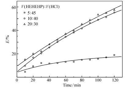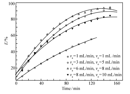 分散相中萃取剂与反萃剂的体积比也会影响稀土元素的萃取。 当分散相中萃取剂及反萃剂浓度恒定,反萃剂HCl溶液占的体积比越大,萃取剂的物质的量减少,稀土金属萃取率减小。 固定反萃分散相中萃取剂浓度,采用4.00 mol/L的HCl水溶液为反萃剂,研究分散相中萃取剂与反萃剂的量对Yb3+萃取行为的影响。 如图5所示,萃取剂与反萃剂的体积比分别为1:9、1:4和2:3时,120 min时Yb3+的萃取率为19.65%、55.28%和57.43%。 当萃取剂的量太少,萃取过程不能很好的实现,萃取率低。 萃取剂用量越大,分散相中的有机液滴越多,增加了稀土离子与萃取剂的接触,提高了萃取率。