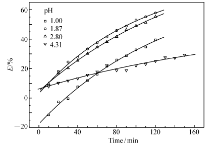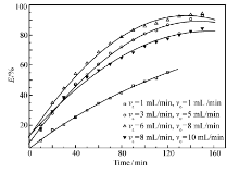调节管程压力高于壳程压力,以保证在膜的微孔中充满有机萃取相,以维持一个稳定的两相界面。 每间隔10 min分别从料液罐和反萃罐中取样用EDTA滴定法分析稀土离子浓度,测定萃取率 E。