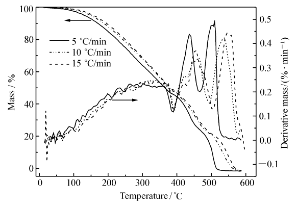 在N2气气氛下Merey原油加热失重结果仅反映原油的热解特征。 从图3可知,DTG曲线出现两个失重峰:从失重开始到370 ℃的宽失重峰,峰值温度260 ℃,在5 ℃/min温度升至370 ℃时的失重率约61%;在370~500 ℃之间出现快速失重峰。 升温速率增加,快速失重终止温度升高,最终失重率降低,形成更多的焦炭。 这与图1中升温速率提高,热解段的生焦量降低的结论相反,这是图1中在热解段结束前已经有部分焦炭在空气下完全氧化所致。
