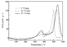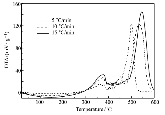 阶段Ⅳ为高温氧化(HTO)段(燃烧段),是以阶段Ⅲ通过缩合反应生成的焦炭为燃料的完全燃烧过程。 该过程生成CO2、H2O及少量CO、N2、SO2等气体组分,在图1的TG曲线上表现为快速失重;由于燃烧反应为强放热反应,在图2的DTA曲线上出现强放热峰。 若将高温燃烧段的失重量看成热解段的生焦量,从对图1的分析可得出,升温速率从5 ℃/min提高到15 ℃/min,热解过程的生焦质量分数从24.9%降至21.4%,即升温速率提高,热解段的生焦量降低。 从表3可知,升温速率增加,氧化反应的峰温高移。