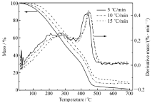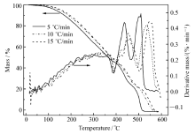 | 图1 在空气气氛下Merey原油线性升温过程的TG/DTG曲线Fig.1 TG/DTG curves of Merey crude oil heated with a linear heating rate in air |