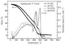 | 图4 Merey原油在空气和N2气气氛下TG/DTG曲线对比Fig.4 Comparison of TG/DTG curves of Merey crude oil in air and under N2 |