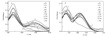 为了检验AcO-浓度变化所产生的影响,向浓度 c=2×10-5 mol/L的探针SAF1和SAF2溶液中分别加入等体积216倍不同浓度的AcO-并测定紫外-可见光谱如图2所示。