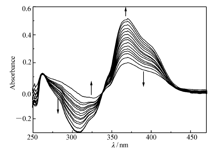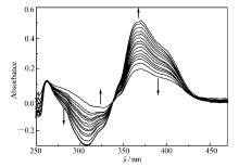 探针L(50 μL)在DMSO体系中随着Zn2+(5.0×10-3 mol/L)浓度增加的紫外吸收变化曲线,如图1所示。 可见,探针L在370 nm处有一个吸收峰,随着Zn2+的不断加入,在262和389 nm处的吸收峰强度不断减弱,在257和326 nm处吸收峰强度不断增强,说明配体L与Zn2+不断配合,形成了新的金属配合物。 在262、339和431 nm处明显的等吸收峰也充分的证明了配体L与Zn2+已经形成稳定的配合物。 在300~330 nm之间,由于DMSO本身的吸收非常强,而DMSO又可与探针L一起与锌离子形成混合配合物,这样随着锌离子浓度增加,混合配合物增多,干扰了吸光度,所以在这一波长范围内的吸光度产生了负值。