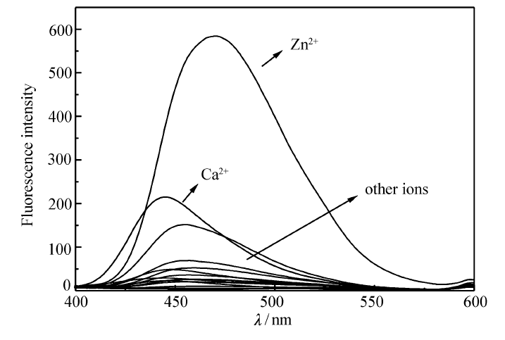 在检测配体L对不同金属离子识别能力的实验中,选择K+、Ca2+、Na+、Mn2+、Fe3+、Fe2+、Co2+、Ni2+、Cu2+、Cd2+、Hg2+、Pb2+、Al3+、Zn2+为识别对象,分别在含有20 μL配体L的缓冲溶液中加入同样比例的金属离子水溶液(5.0×10-3 mol/L),测定其荧光发射光谱变化曲线(图3)。 可见,除Ca2+外其它金属离子并未引起体系荧光强度明显的变化,其中Ca2+引起体系最大荧光强度下波长的蓝移,但比较荧光强度变化不大。 综上可以看出,探针L对Zn2+具有良好的选择性。
