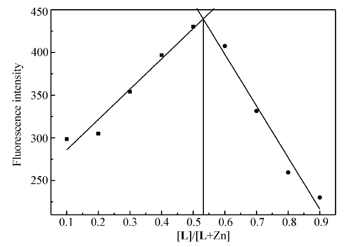 通过等物质的量连续变化法(Job's-Plot),研究了探针L与Zn2+的配合比,配制一系列L与Zn2+的混合溶液,体积比分别为1:9、2:8、3:7、4:6、5:5、6:4、7:3、8:2和9:1,总体积保持为20 μL,测定其最大荧光强度。 如图5所示,当探针L的摩尔比在0.5左右时,体系的荧光强度最大,说明探针L与Zn2+形成配合物的比例为1:1。